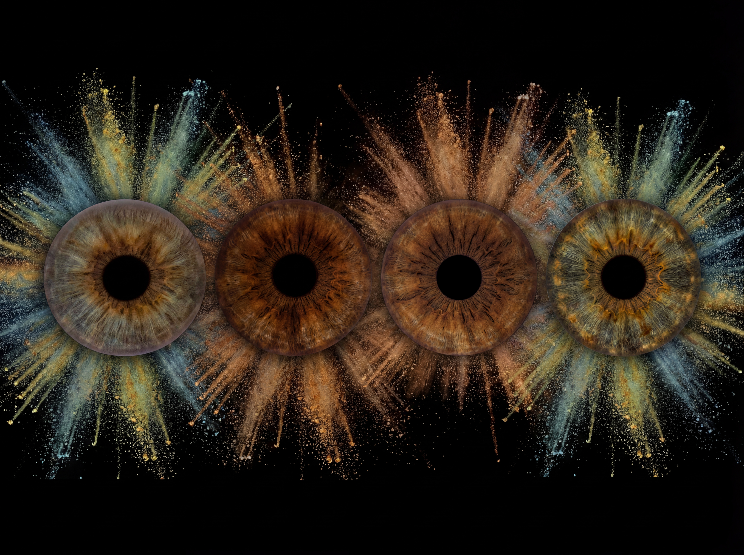 Experience the spectacular collision of four unyielding spirits visualized. The "Elemental Quad Exploded" aligns your unique irises within a dynamic, powerful field of custom-colored powder blasts. To ensure absolute bespoke personalization, the specific surrounding dust and energy—whether deep gold, copper, electric blue, or emerald green—is meticulously custom-matched to the unique colors found within your specific irises. This design celebrates the wild yet harmonious energy of your deepest family or friendship bond, turning a shared moment into an explosive and Defiant masterpiece of truly personalized living energy.