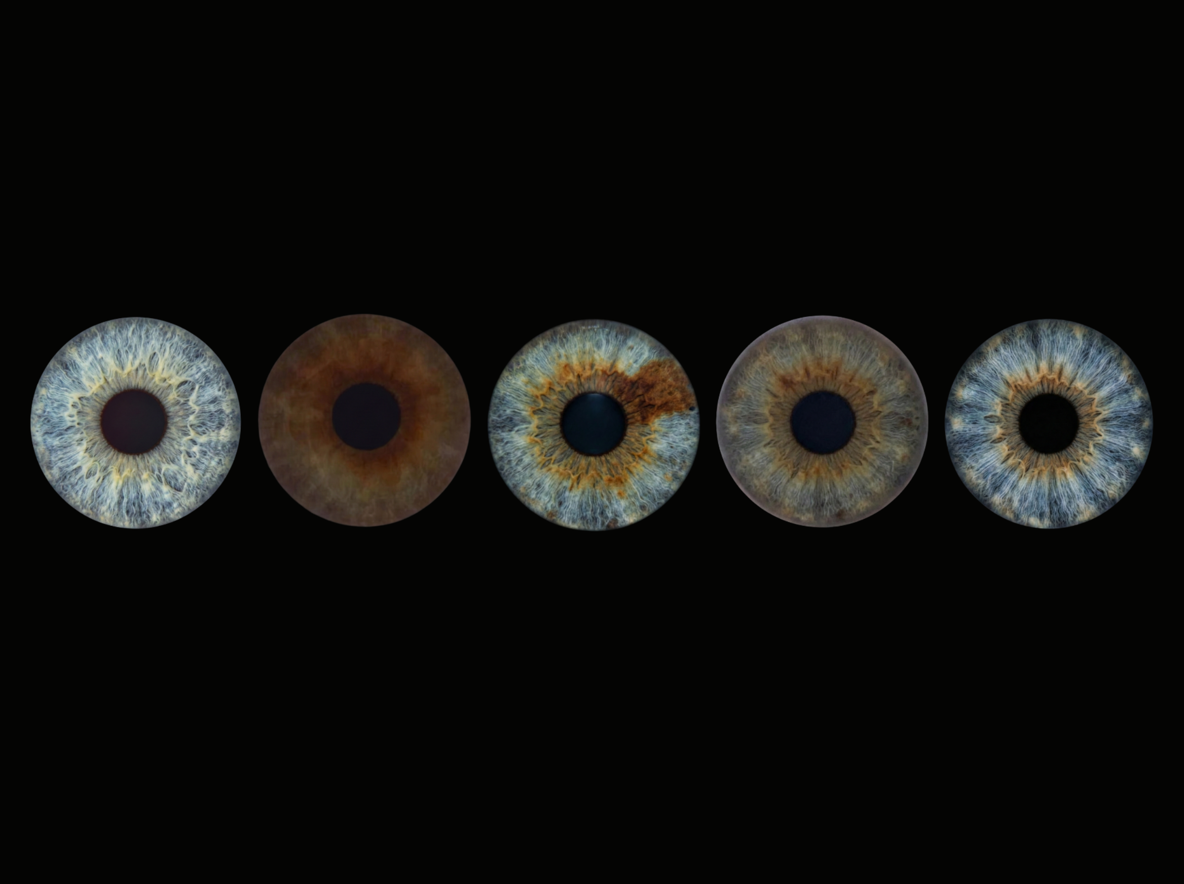 Custom iris art photography featuring five detailed human eye irises aligned horizontally against a pure, deep black background with no special effects. The unique and intricate iris patterns include light blue, brown, hazel, and green irises, presented in absolute clarity and raw detail. This minimalist wall art print visualizes a profound family bond or friendship connection, suitable for a sophisticated, purist home decor gallery that celebrates natural beauty and unfiltered connection.