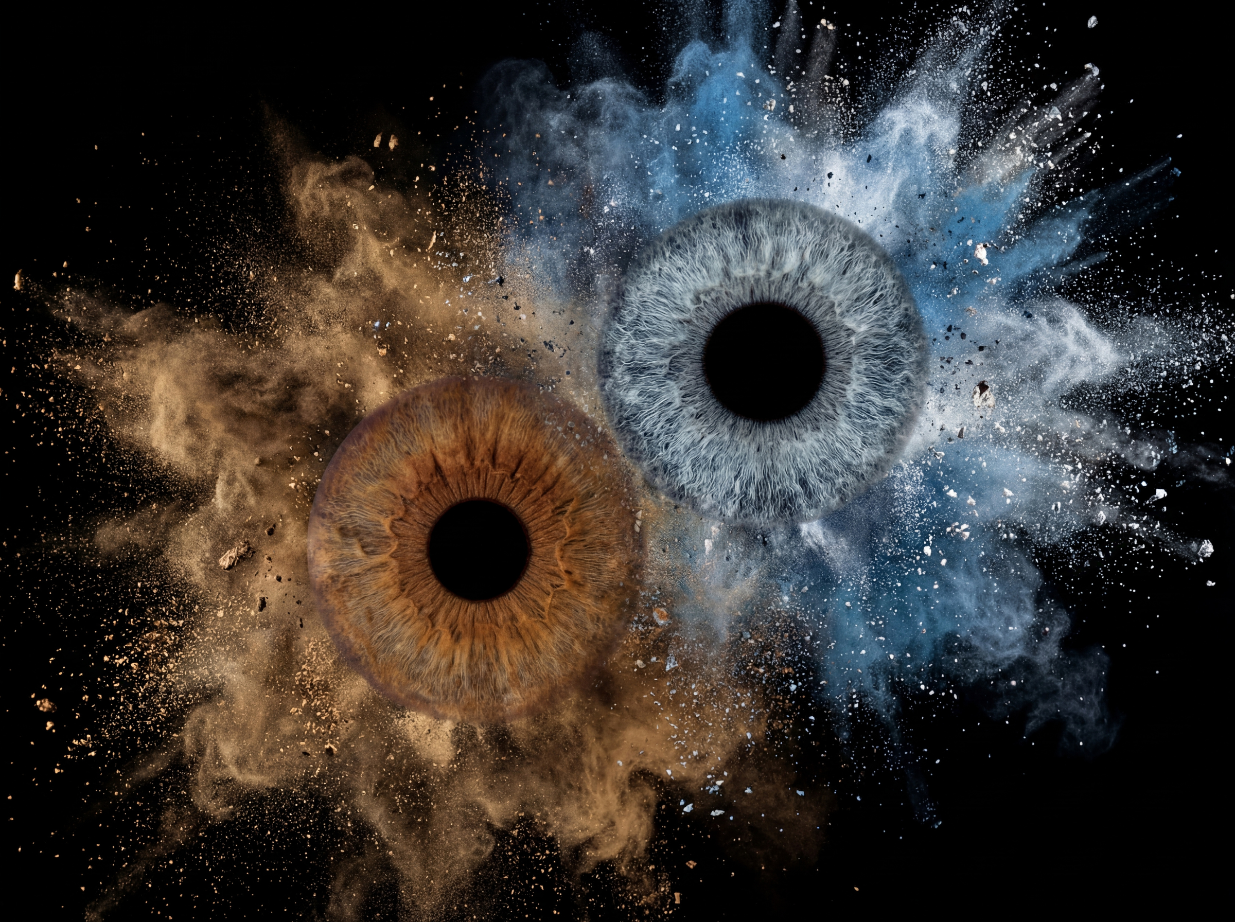 A bolder exploration of your shared atmosphere. This "POPULAR" Soul Mist design wraps your irises in deep, dynamic clouds of blue and warm gold mist, symbolizing the magnetic, undeniable force that binds your lives together. It is a more intense, dramatic expression of spiritual unity and atmospheric beauty.